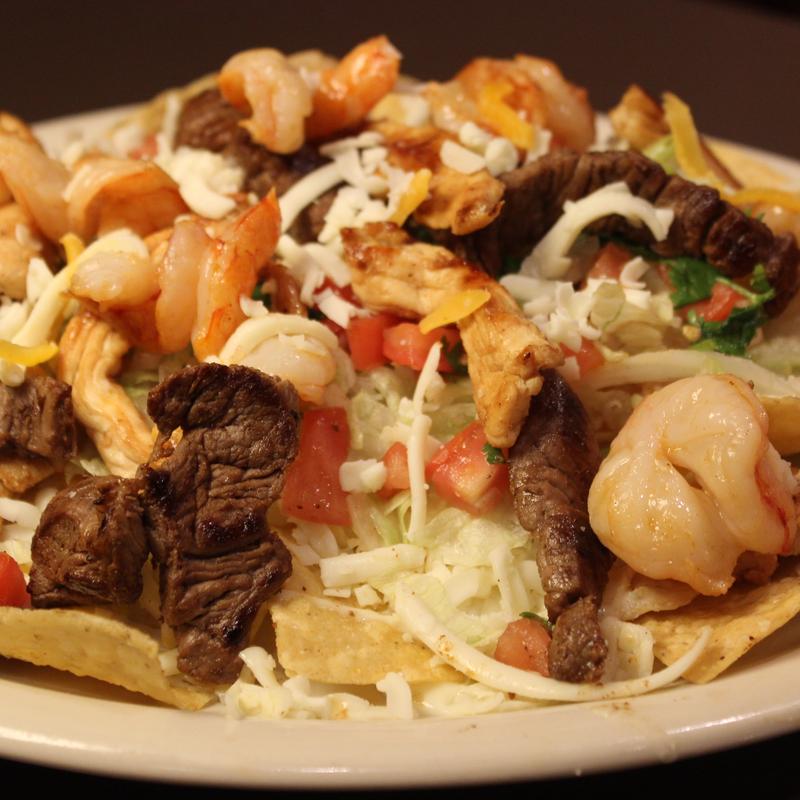 Letuce, Pico de gallo, steak, chicken, shrimp, with grilled peppers, onions and tomatoes.